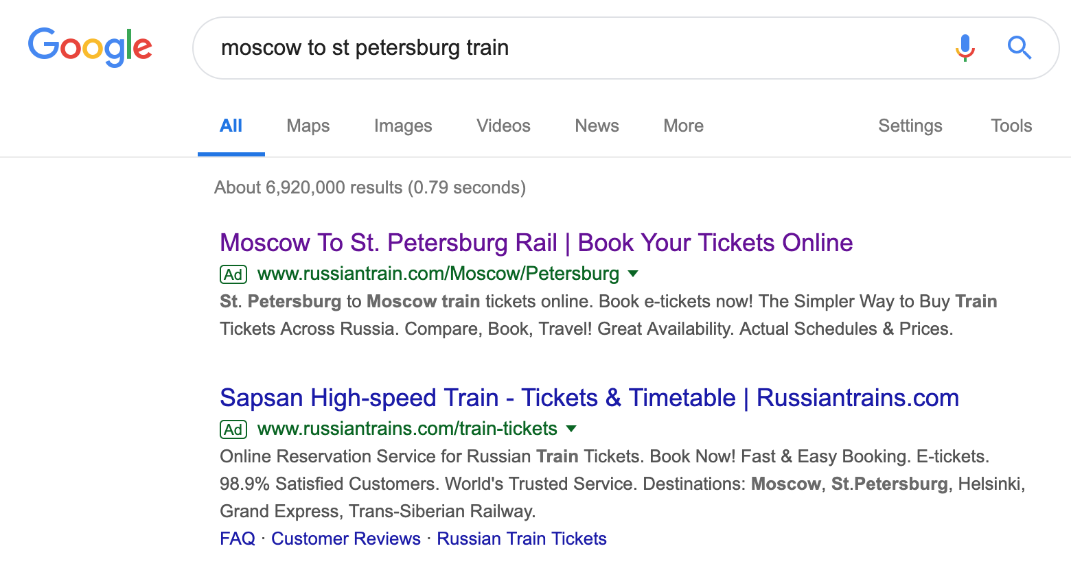 일단 구글에 모스크바에서 샹트페테부르크 기차를 검색을 했더니 여러 웹사이트가 나왔는데 그냥 제일 상단에 russiantrain.com 사이트로 들어갔다. 참고로 한국어로 번역된 웹사이트도 있었는데 같은 사이트임에도 불구하고 가격이 한국어 사이트가 더 비쌌다. 그래서 그냥 영문사이트로 진행함