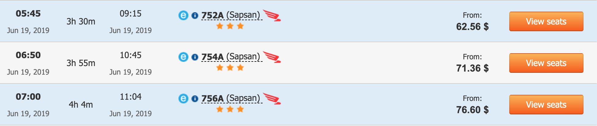 서치를 클릭하면 그 날짜에 이용가능한 기차가 나오는데, 거의 24시간 운행을 할 정도로 기차는 엄청 많다. 첫 차가 새벽 0시 10분부터 시작해서 마지막 차라 23시 55분까지 있는 것으로 보아 러시아에 아침에 도착하던 저녁에 도착하던 상관없이 편한 시간에 맞춰서 표를 구매해서 샹트페테부르크로 올라갈 수 있다. 러시아 도착이 저녁이라 걱정했는데 다행히 기차도 많고 표도 많이 남아서 다행이었다.