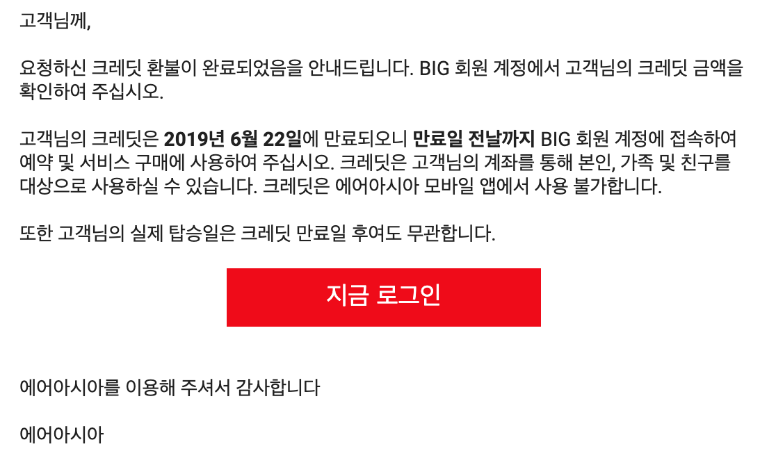 저 같은 경우엔 혹시 몰라서 그냥 크레딧으로 받았습니다. 아 물론 한국 콜센터에 전화해서 환불을 받는 방법도 있었지만 어쨌든 저는 타고 와야 했고 날짜는 정하지 않아서 항공권 변경 옵션은 선택하지 않았습니다. 그리고 콜센터 전화가 안된 것도 환불을 안 받은 이유 중에 하나 이기도 합니다. 여하튼 크레딧를 지급받았고 만료 날짜 6월 22일 전까지만 사용하면 됩니다. 근데 이 크레딧 받는 시간이 한 2주 정도 걸렸다는 점 참조 바랍니다. 일 처리가 너무 느려...