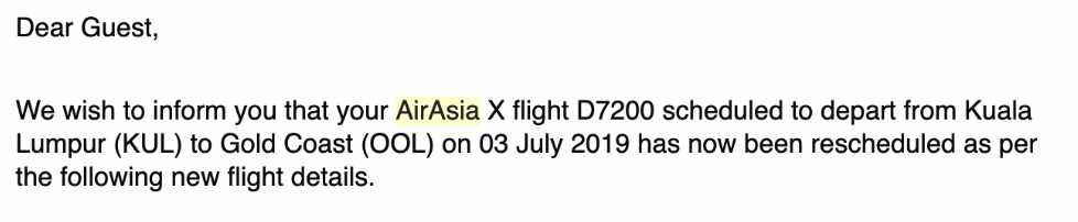 제가 받은 이메일입니다. 위에 보시면 7월 3일에 출발하는 비행기가 리스케쥴이 됐다고 하는 내용입니다.