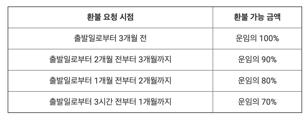 출발일로부터 3개월 전까지는 한국으로 입국/한국에서 출국하는 항공권은 100% 환불을 받을 수 있다는 규정이 있습니다. 기간이 줄어들수록 운임의 90%, 80%, 70%까지 줄어들지만, 정말 환불이 급한 경우엔 출발 3시간 전에만 환불 신청을 해도 항공권 운임의 70%를 환불을 받을 수 있다는 점입니다. 물론 3시간 전에 콜센타에 연락을 해서 환불을 받을 수 있다면 좋겠지만 보통의 경우 에어아시아는 문의 전화도 잘 안 받고 해서 글을 써서 환불 절차를 밟아야 하는데 잘못하면 환불을 못 받을 수도 있으니 (저 같은 경우는 환불받는데 까지 거의 2주 소요) 항공권 취소 및 환불을 원하시면 하루빨리 환불 신청을 해서 받아야 합니다.